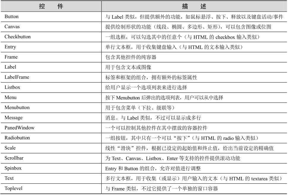 在 GUI 编程中,顶层的根窗口对象包含组成 GUI 应用的所有小窗口对象。它们可能是文字标签、按钮、列表框等。这些独立的 GUI 组件称为控件。所以当我们说创建一个顶层窗口时,只是表示需要一个地方来摆放所有的控件。在 Python 中,一般会写成如下语句。
