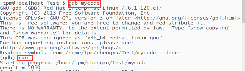 通过这编译我们可以得到一个名为mycode的可执行文件。再使用 gdb mycode就可以进入调试模式。