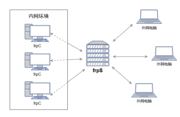 FRP 就像一个你信任的“中介服务”(公网服务器),你在家里(内网)主动告诉中介你的房间号和信息。