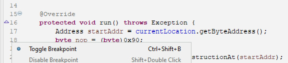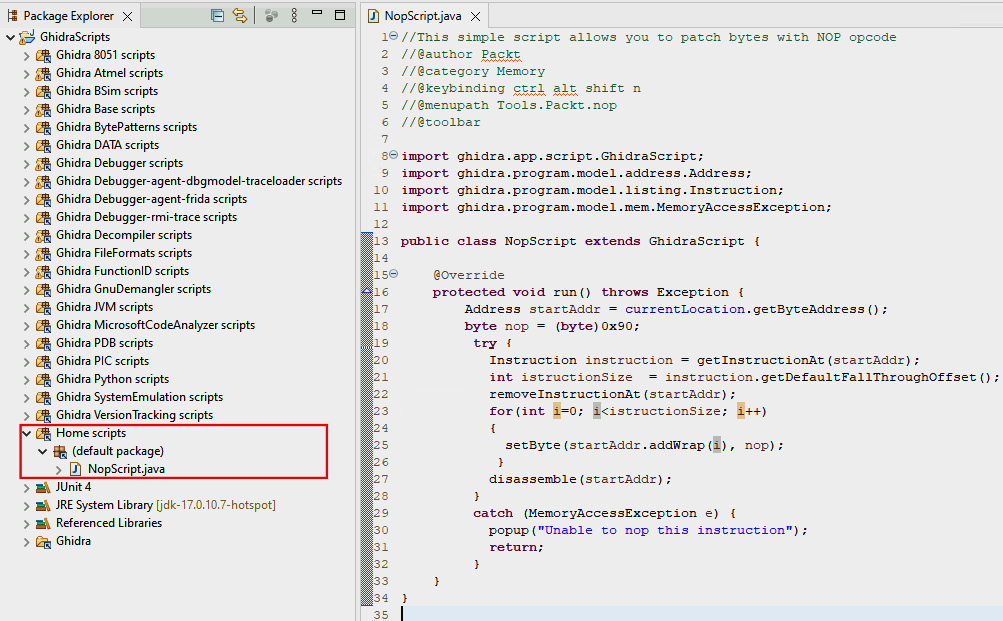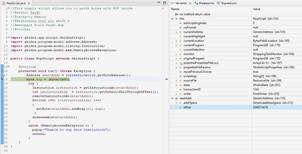 让我们调试在 NopScript.java 中开发的 Ghidra 脚本代码,该代码来自 第 2 章 《 使用 Ghidra 脚本自动化逆向工程任务 》,方法是将其粘贴到现已与 Ghidra 集成的 Eclipse 中。