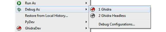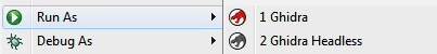 右键点击 项目并选择 运行为 或 调 试为 ,您会注意到在安装 GhidraDev 插件时 已自动创建了运行和调试两种模式。