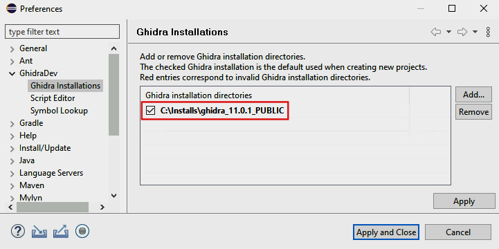 Ghidra 安装 可以通过点击 添加… 按钮来新增,通过选择表格中的安装行并 点击 移除 来删除 :