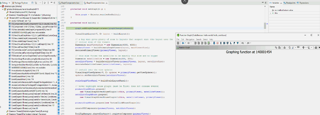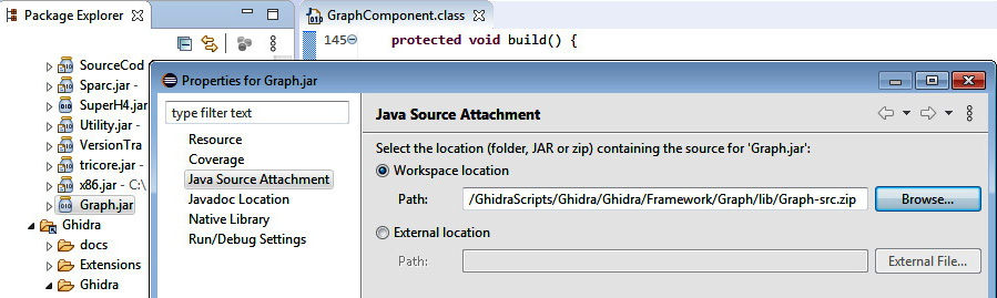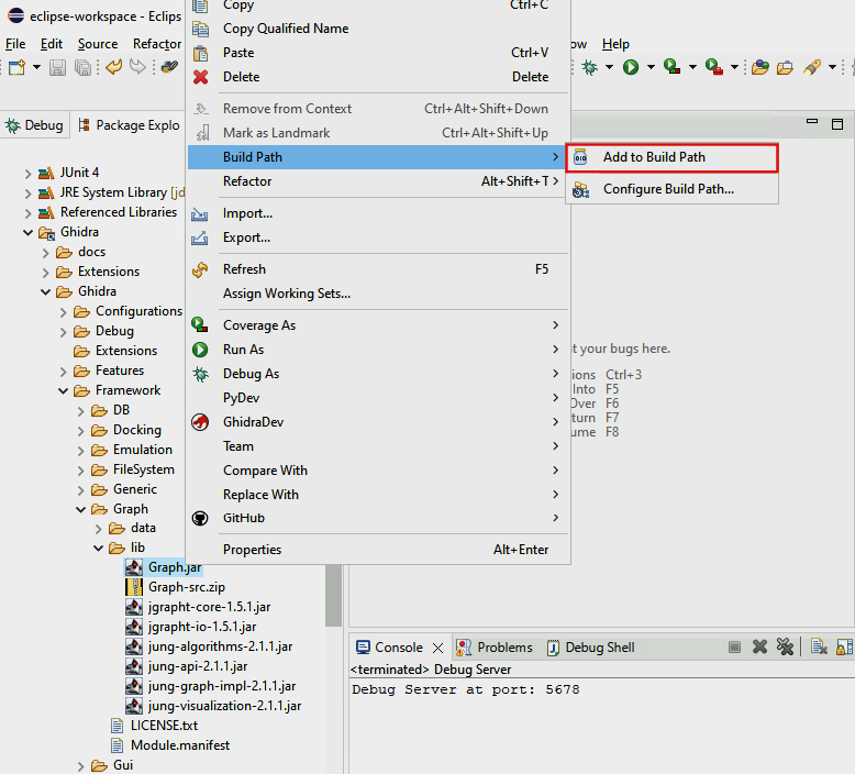 您不仅可以调试插件, 还能调试 Ghidra 中的任何功能。 例如,若要调试函数图功能,您可以在 Package Explorer 中将对应的 JAR 文件添加到构建路径。 这种情况下, 该 JAR 文件就是 Graph.jar :