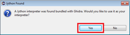 若要使用 Ghidra 自带的解释器(位于以下目录: <GhidraInstallDir>\Ghidra\Features\Python\lib\jython-standalone-2.7.3.jar ),且已将该 Ghidra 实例关联至项目,系统将提供此选项,可免去手动查找的麻烦。 在弹出的 对话框中选择确认