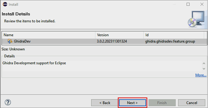 之后, 您可以借机查看安装详情。 再次点击下一步 > 以继续安装 GhidraDev: