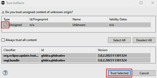 这种情况下会出现信任警告。 无需担心。 该插件的真实性 无法验证,因为 它未经过签名。 请检查 未签名 表格条目(这将高亮显示我们插件的 ghidra.ghidradev ID),然后点击 信任选定 项 继续: