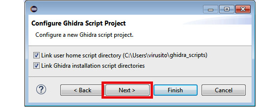 点击 下一步 > 后,您可以选择是否将已开发的脚本链接到项目(在我的案例中是 C:\Users\virusito\ghidra_scripts )以及 Ghidra 安装包中包含的脚本, 通过 复选框进行选择: