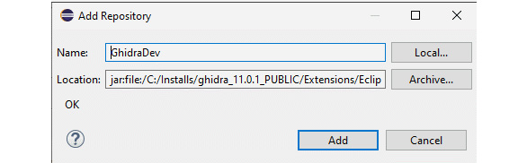 图 3.11 – 将 GhidraDev 添加为 Eclipse 本地仓库