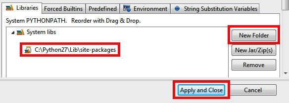 将该 文件夹添加至 PYTHONPATH 中,使用 新建文件夹 功能,确认添加成功后(如下图所示),点 击 应用 并关闭 :