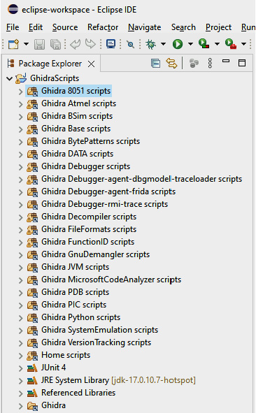 当我们创建的 Ghidra 脚本项目在 Eclipse IDE 中加载后,Package Explorer 会显示来自 Ghidra 安装目录的现有脚本文件夹(选中任意脚本后按 Alt + Enter 快捷键组合可查看其路径),默认情况下还会显示位于 % userprofile%\ghidra_scripts\ 目录中的个人脚本。