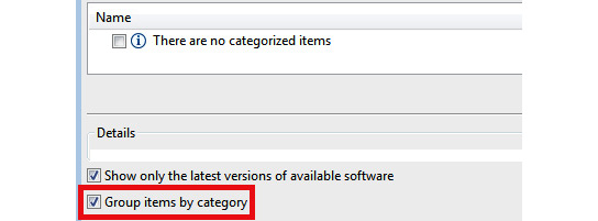在此步骤卡住是很常见的情况。 如下图所示,由于所有安装项都按类别分组,因此没有显示分类项目。 请取消勾选 按类别分组项目 选 项以 解决此问题: