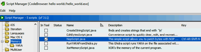 要强制 Ghidra 运行到断点所在的行, 您需要通过 GhidraDev 在已与 Eclipse 同步的 Ghidra 文件中选定字节运行该插件。 如果在 Ghidra CodeBrowser 的工具菜单栏中未找到您的插件,请前往脚本管理器并在左侧面板选择内存类别。 这将使您的脚本 NopScript.Java 显示在右侧。 接着勾选工具内工具选项:
