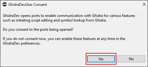 当 重新启动 Eclipse IDE 时,我们新安装的 GhidraDev 插件会请求开放端口的许可。 这是与 Ghidra 进行通信的必要条件。 请点击 是 按钮授予许可。