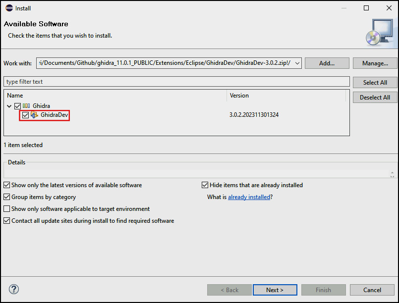 类似于我们安装 PyDev 的方式,要实现 Ghidra/Eclipse 同步,你需要安装 GhidraDev 插件,该插件位于 Ghidra 安装目录下的 Extensions\Eclipse\GhidraDev\GhidraDev-3.0.2.zip,但这次不要解压缩,而是使用归档文件… 选项: