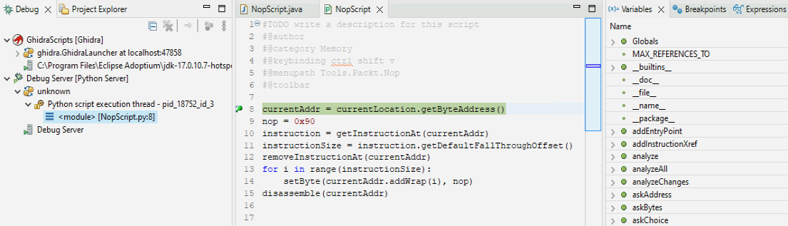 图 3.38 – 在 Ghidra 中调试 NopScript.py