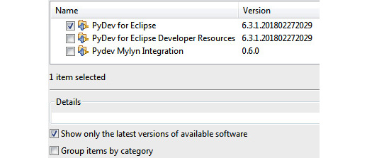 取消 勾选 按类别分组项 目 后, 您就能选择 PyDev for Eclipse 选项来 进行安装: