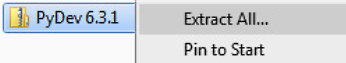 在安装 Eclipse 后,通过右键点击并选择 ,将我们之前在实验室设置时下载的 PyDev 6.3.1 ZIP 文件内容解压或解压缩到文件夹中,操作时选择全部解压... :