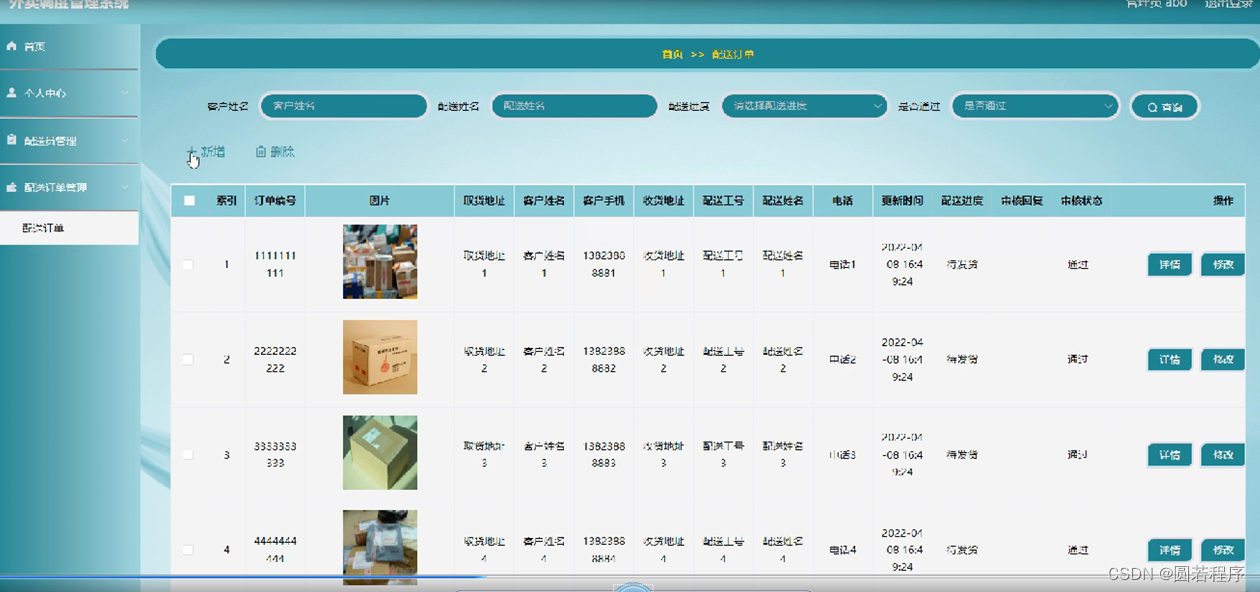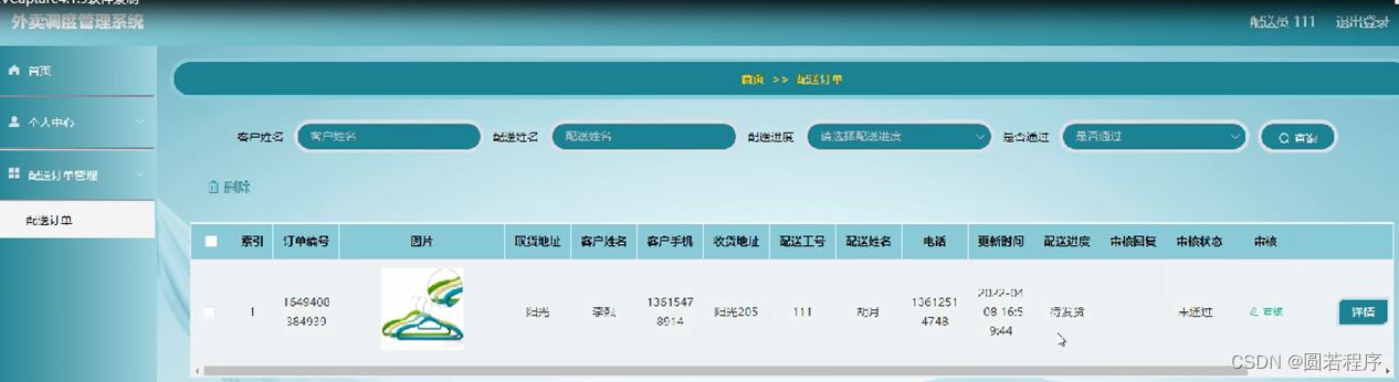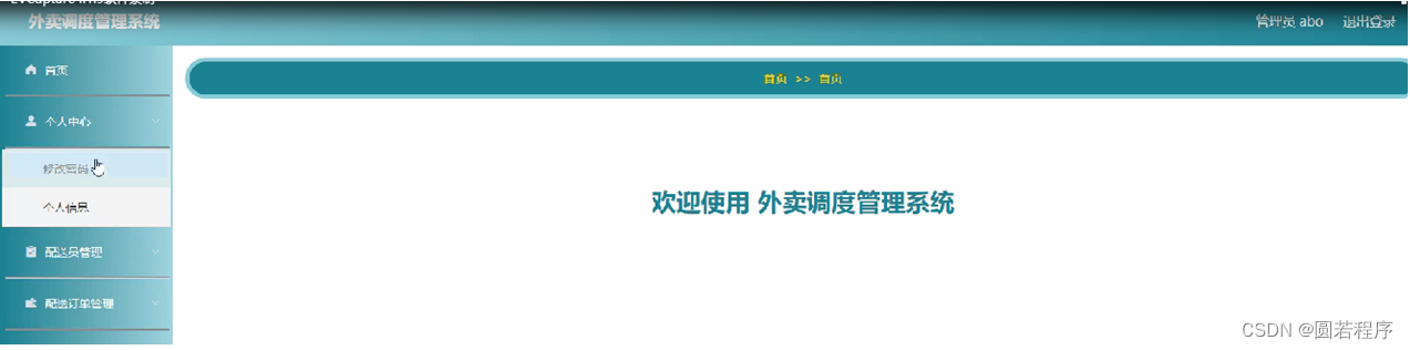 管理员功能包括首页,个人中心、配送员管理,配送订单管理等功能。