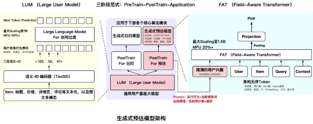 更重要的是,LUM 并非孤立模型,而是搜推广系统的通用认知基座。通过“PreTrain–PostTrain–Application”三阶段范式——既可用于生成式召回模型,也可于生成式预估模型。这种“一个底座、多处复用”的架构,极大提升了算力投资的边际效益。