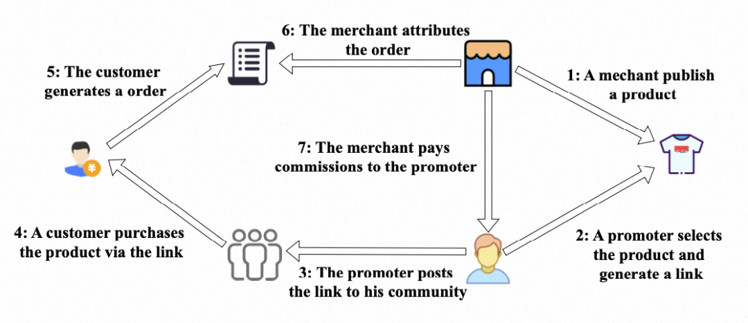 联盟营销(Affiliate Marketing)是现代数字营销的关键模式之一。它构建了一个由商家、推广者和消费者构成的三方共赢生态。其基本流程如下图所示:商家发布商品,推广者从中挑选商品并生成专属推广链接,分享至自己的私域渠道。当消费者通过该链接完成购买后,平台会将这笔订单归因于该推广者,并支付其相应佣金。