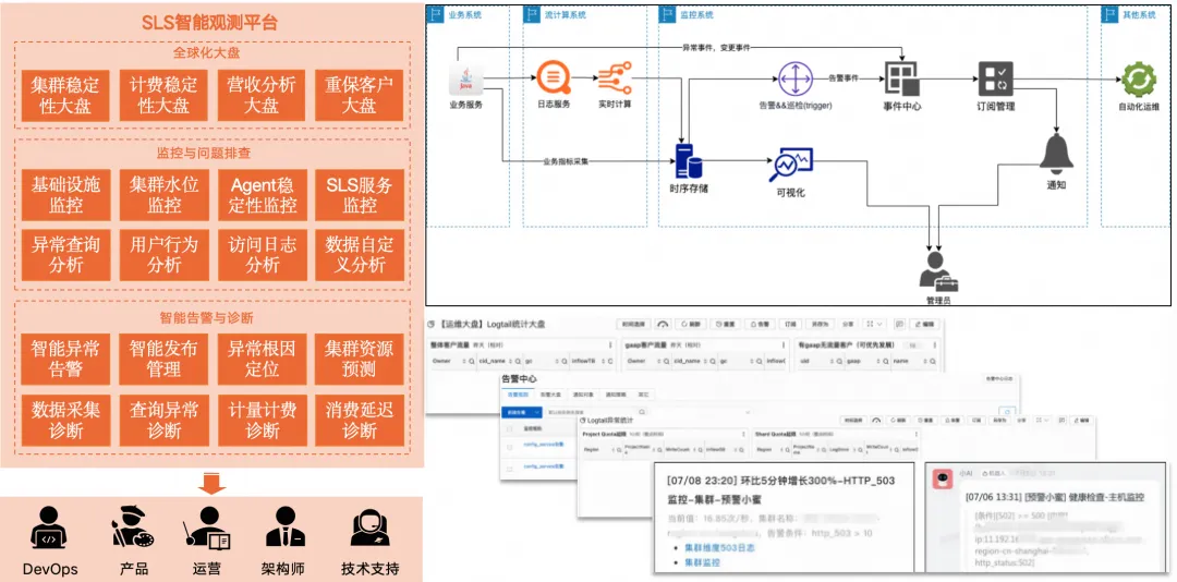 为了使这些指标的作用最大化,iLogtail 基于 SLS 服务自身构建了一个智能可观测平台。SLS 本身已经具备了构建可观测平台的诸多基本功能,如数据采集、流式计算、数据存储、即席查询、可视化仪表盘、告警通知、智能预测等,利用这些能力就可以构建出一个智能可观测平台。