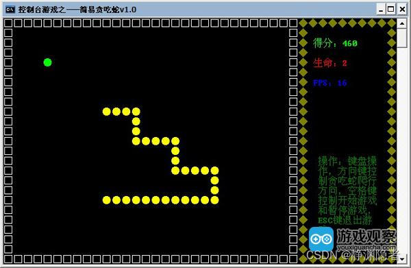 - 使用控制台字符输出函数绘制游戏界面,可使用特定符号表示蛇、食物和边界。