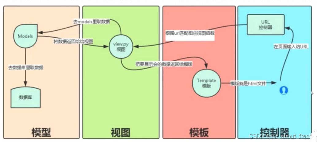 首先包含四部分:模型、视图、模板、控制器