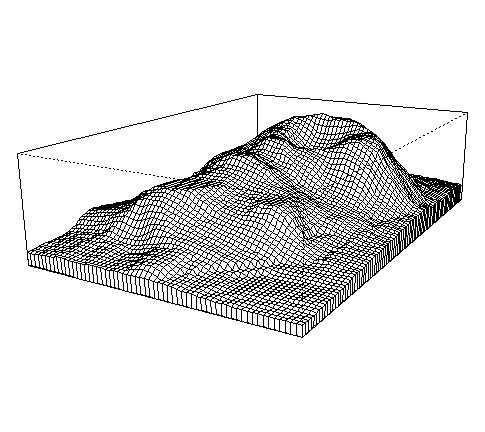 ## 绘图 par(mar=rep(0,4)) persp(x, y, z, theta=120, phi=15, col = fcol, scale = FALSE, shade = 0.4, border = NA) |