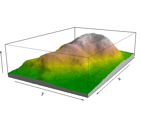 ## 创建一份新的用于绘制的网格数据集 #z0是用于设置栅格边缘的颜色 z0 <- min(z) - 20 #用z0的颜色,把整个栅格包裹起来 z <- rbind(z0, cbind(z0, z, z0), z0) #用x的最小值和最大值,把x包裹起来,对应上面那个z0 x <- c(min(x) - 1e-10, x, max(x) + 1e-10) #用y的最小值和最大值,把x包裹起来,对应上面那个z0 y <- c(min(y) - 1e-10, y, max(y) + 1e-10)