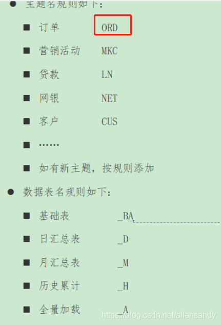 例如:DW_ORD_DETAIL,表名长度不超过30个字符。