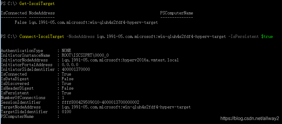 接下来,我们可以为目标门户添加目标iqn名称。为此,我们运行 connect-iscsitarget命令。