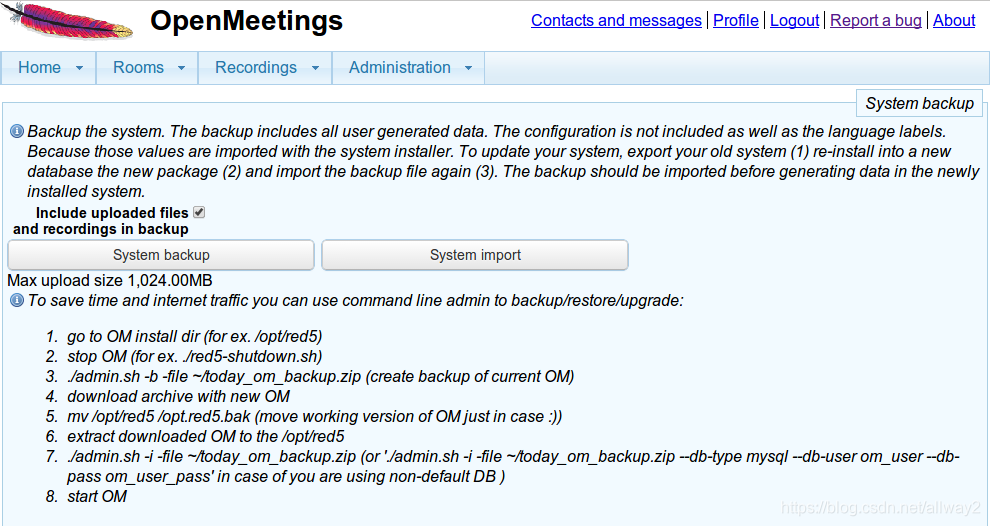 您可以将所有用户生成的数据(包括用户上传的文件)备份到一个ZIP文件中,然后将该ZIP导入到新的OpenMeetings安装中。