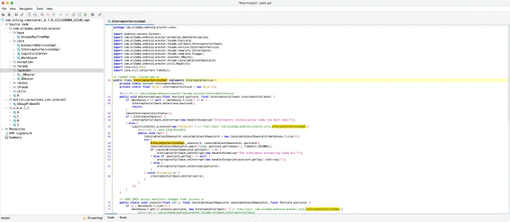 再比如说我们想看看某个 apk 的源码,我们拿到 apk 之后直接拖入进 jadx 中就可以了。效果如下: