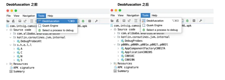 经过混淆的代码在功能上是没有变化的,但是去掉了部分名称中的语义信息。