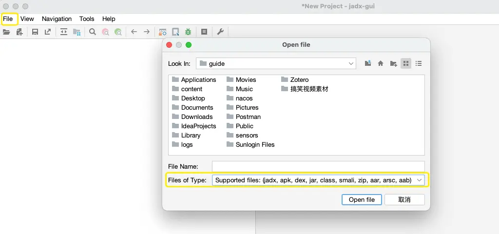 从上图可以看出,jadx 支持.apk, .dex, .jar,.zip,.class等格式的文件。