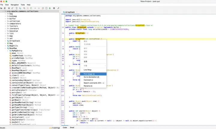 就比如说我们需要反编译一个 jar 包查看其源码的话,直接将 jar 包拖入到 jadx 中就可以了。效果如下: