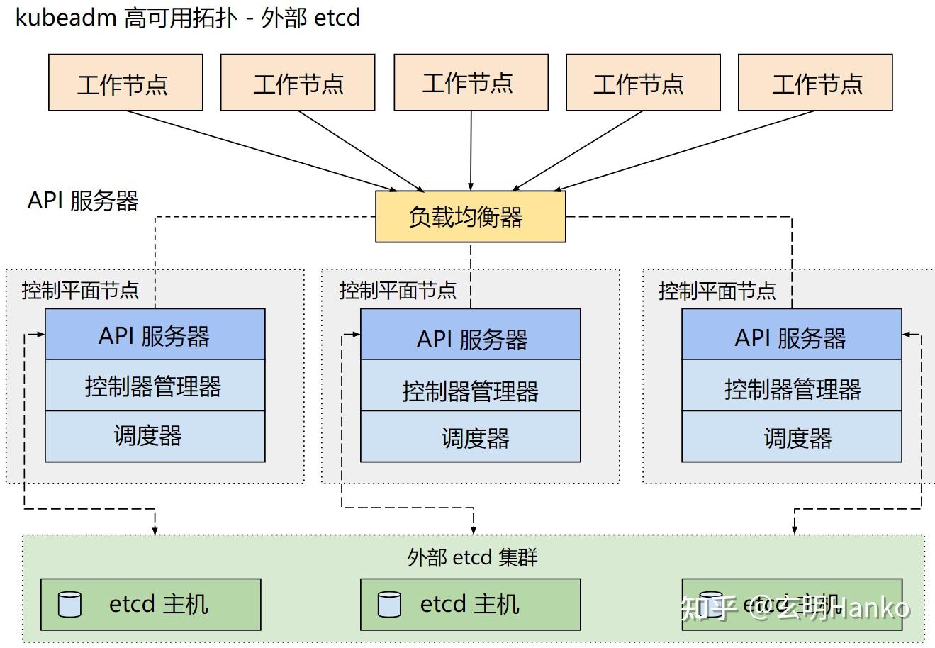 就像堆叠的 etcd 拓扑一样,外部 etcd 拓扑中的每个控制平面节点都会运行 kube-apiserver、kube-scheduler 和 kube-controller-manager 实例。 同样,kube-apiserver 使用负载均衡器暴露给工作节点。但是 etcd 成员在不同的主机上运行, 每个 etcd 主机与每个控制平面节点的 kube-apiserver 通信。