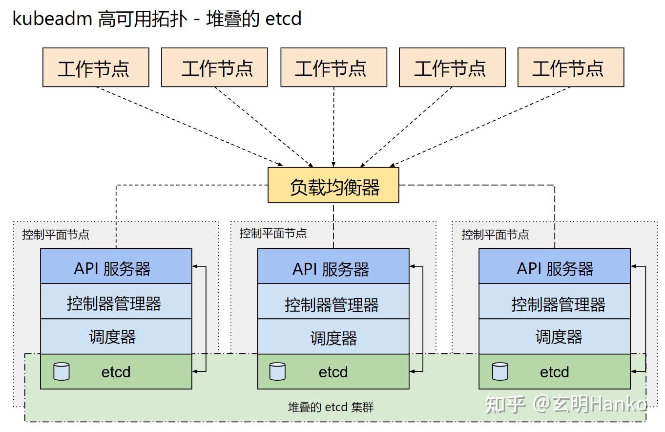 堆叠(Stacked)HA集群是一种这样的拓扑,其中 etcd 分布式数据存储集群堆叠在 kubeadm 管理的控制平面节点上,作为控制平面的一个组件运行。
