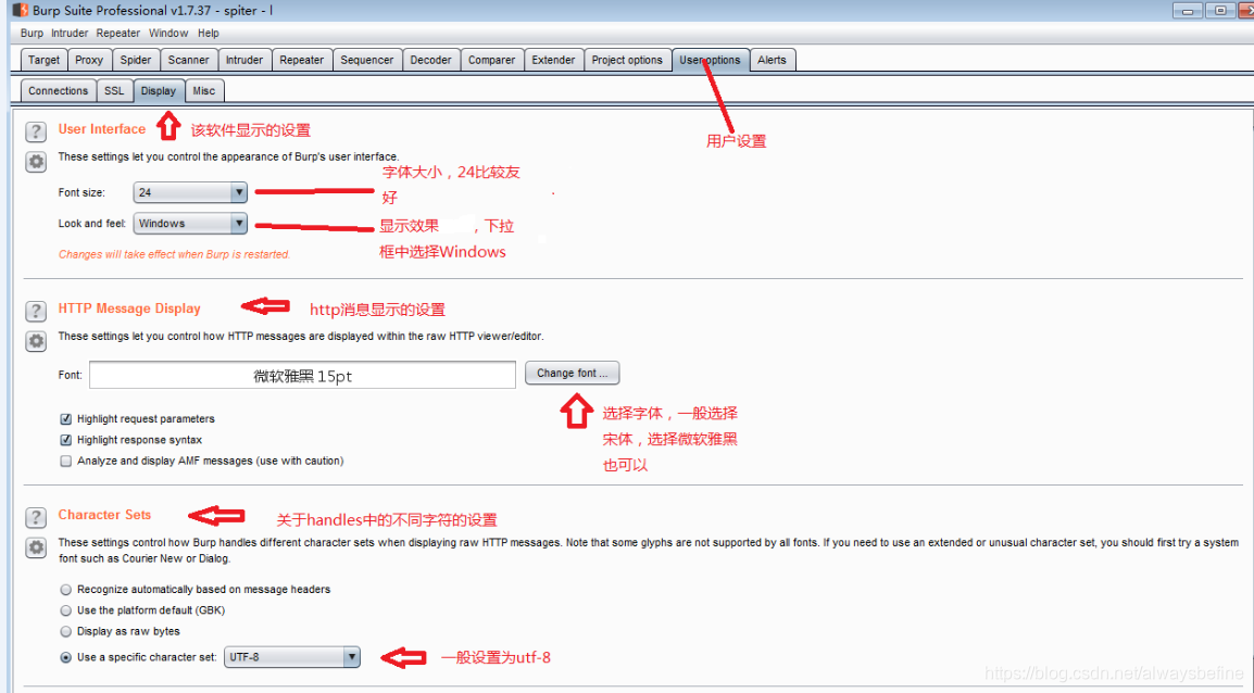 burpsuite软件如果不设置默认的话,会在handers和rwa栏内显示乱码,这给我们使用软件造成很大的困扰,如何解决呢?