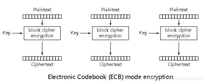 ECB(Electronic Code book, 电子密码本)模式是最简单直接的加密模式,明文消息被分成固定大小的块(分组),并且每个块被单独加密。加密前需要把明文数据填充到块大小的整倍数。