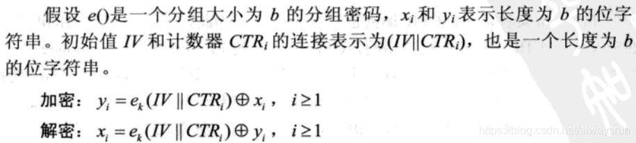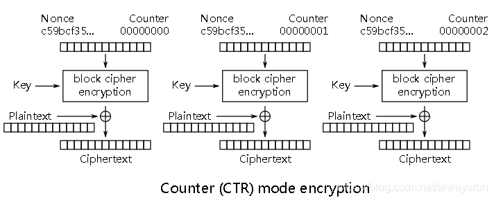 CTR(Counter, 计数器)模式是另外一种序列密码;分组密码的输入为一个计数器。初始化输入(IV)必须谨慎选择,防止重复;