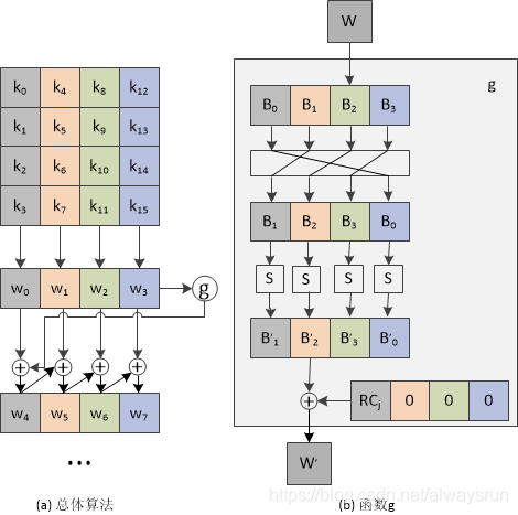 输入的密钥被扩展为44个32位子分组,每轮使用不同的4个分组。加解密算法都是以轮密钥加开始,最后一轮只包括三种操作(没有列混淆)。