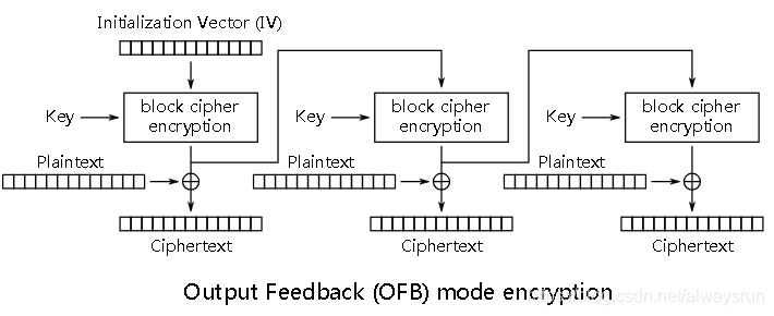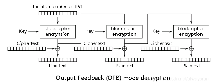 OFB(Output Feedback, 输出反馈)模式将分组密码转换为同步流密码,也就是说可以根据明文长度先独立生成相应长度的流密码。