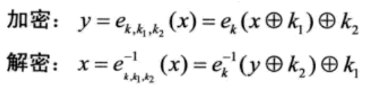 - 密钥漂白:在密钥k之外,增加k1与k2两个漂白密钥,用于与明文和密码进行异或。漂白不能增强大多数分析攻击(如线性密码分析和查分密码分析)抵抗行。因此