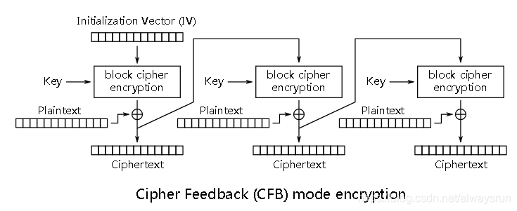 CFB(Cipher Feedback, 密码反馈)模式和CBC模式比较相似: