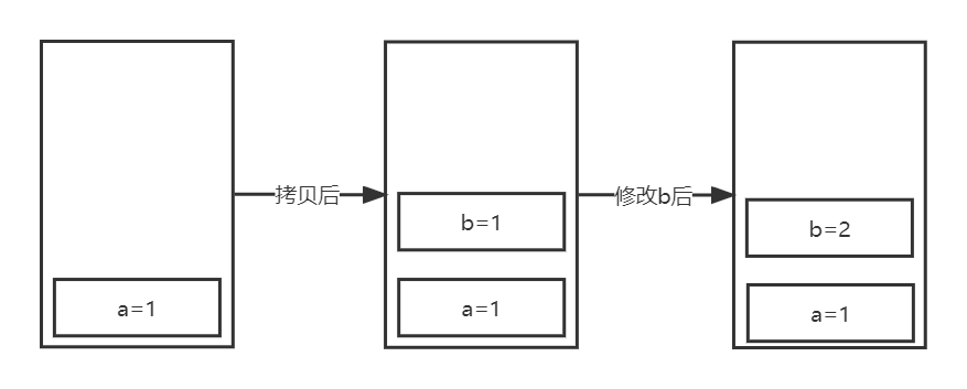 产生这一现象的原因就可以理解为只有存在栈内存的东西才能被拷贝,a为基本数据类型,b拷贝a 后,二者就是一个完全独立的值了,他们分别呗存放在栈中,互不影响;而c是引用数据类型,d拷贝c后,由于栈内存中存放的是引用类型的指针,所以d拷贝出了另一个指针而已,但他们指向的还是同一个堆内存中存放的值,所以改变 其中一个值,另一个也会相应改变。