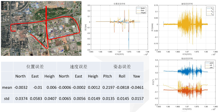 可以选取多条轨迹,在平面位置、高程、航向角、翻滚俯仰角等指标上与真值设备的输出做对比,得出各种场景下的误差范围,据此分析被测设备的性能,为选型做依据。