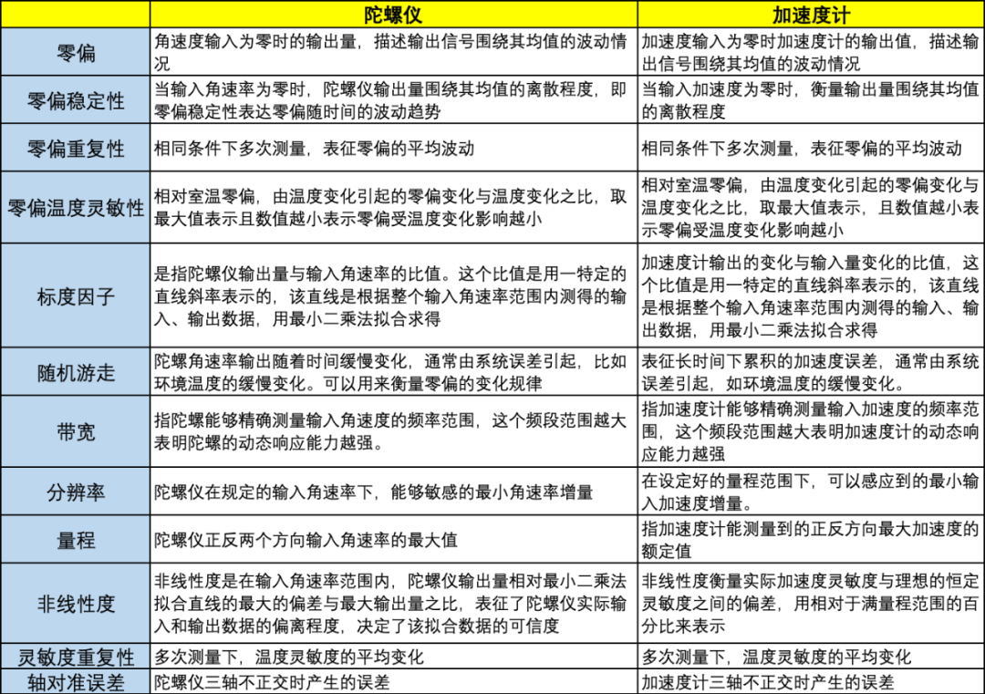 对于性能参数要求,需要从加速度计和陀螺仪两个方面入手,相关的指标较多,一般主要是关注以下这些: