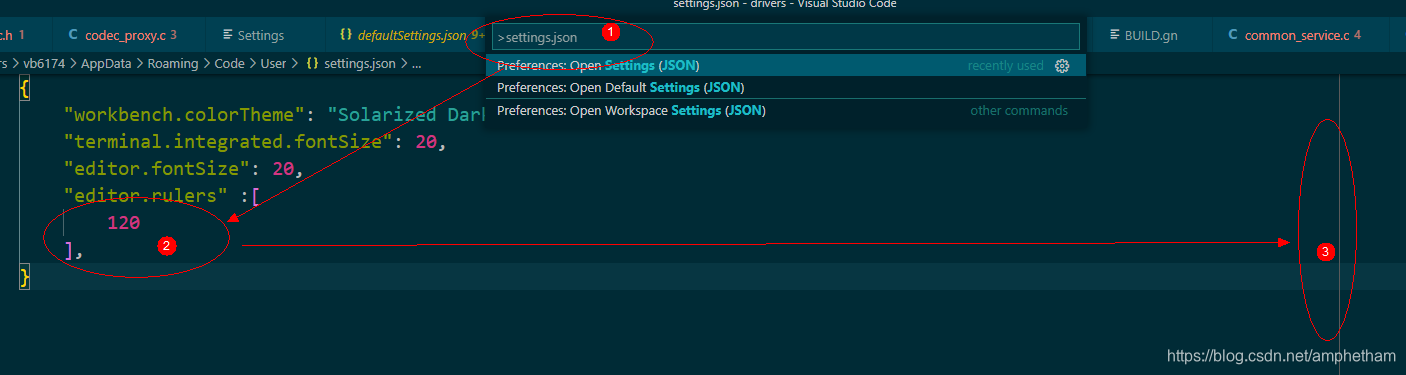 各种工具技巧集 1. Visual Studio Code设置行宽显示:按住F1——settings.json——编辑如下(数字为宽度辅助):"editor.rulers" :[ 120 ],效果如下(3):