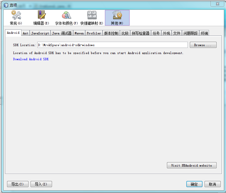可能是由于NBAndroid插件最近的更新,我发现现在的配置过程已经省略了原来把Google Android 平台添加到Netbeans里的这一步骤。所以我们接下来直接可以进行对Android SDK的本地路径进行设置,方法如下: